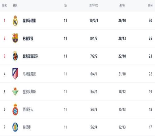 在积分榜,皇马依然排名榜首。皇马10胜1负拿到30个积分。阿隆索率队踢出了如此亮眼的成绩,让人佩服。巴萨拿下埃尔切之后,战绩变成8胜1平2负,总积分是25分,落后5分排名第2。第3的是比利亚雷亚尔,拿到23分。而马竞只拿到22分,排名第4。皇家贝蒂斯赢球之后,总积分达到19分,排名第5。第6的是西班牙人,拿到18分。
