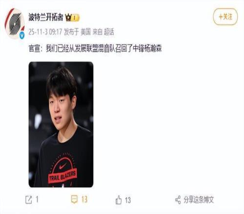 11月3日,@波兰特开拓者 官宣:我们已经从发展联盟混音队召回了中锋杨瀚森。